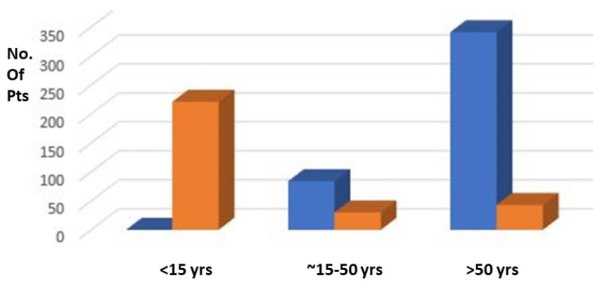 下图显示了OC43的年龄分布与上述425例感染新冠病毒患者的年龄分布对比。从数百个患者样本来看,感染这两种病毒的患者年龄分布之间的对比十分明显,甚至几乎是相反的。