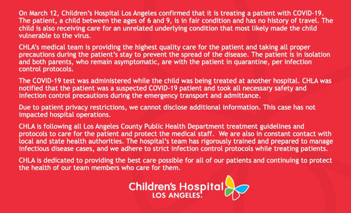 3月13日洛杉矶儿童医院公告(洛杉矶儿童医院推特图片)