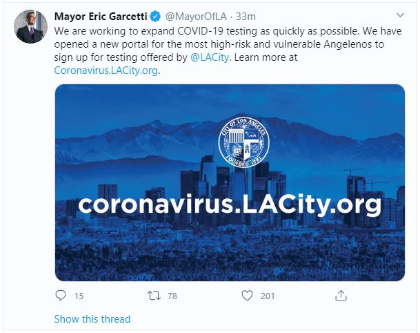【美新社讯】洛杉矶市市长贾西提(Eric Garcetti)在3月22日周日的记者会上表示,洛杉矶官员计划在星期一(3月23日)推出一个新的在线门户网站,以帮助最需要的人加快新型冠狀病毒的测试。