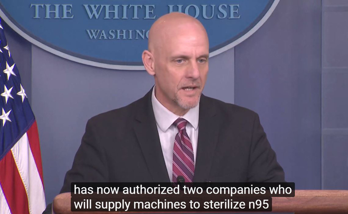 *** 美国食品药品监督管理局(FDA)史蒂芬·哈恩(Stephen Hahn)指出,为了增加一线抗疫最需要的N95的供应量,FDA已经批准了两个厂家,提供急需的N95口罩的消毒技术。