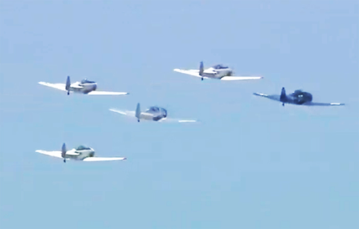 25日,另有5架道格拉斯SBD无畏俯冲轰炸机(Douglas SBD Dauntless)组成编队,并做出一些特技飞行的动作和拉烟表演。(摄影:刘骁宗)