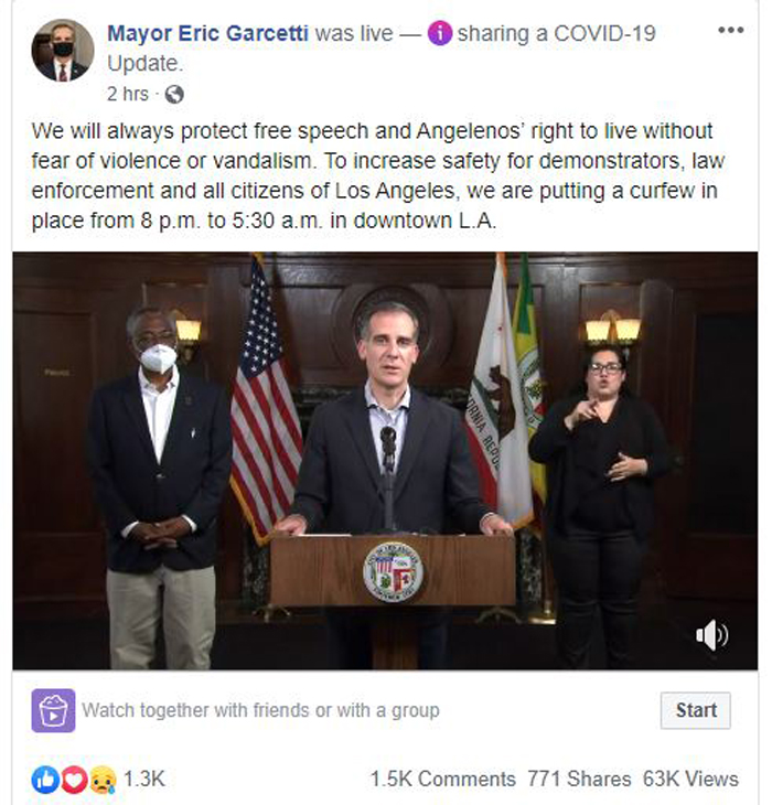 5月30日,市长贾西提宣布宵禁(洛杉矶市市长办公室脸书图片)