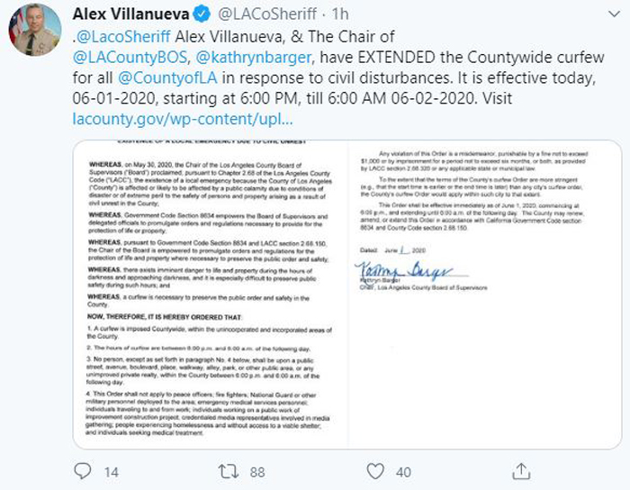 6月1日晚实施宵禁(洛杉矶县警察局(LASD)局长Alex Villanueva推特图片)