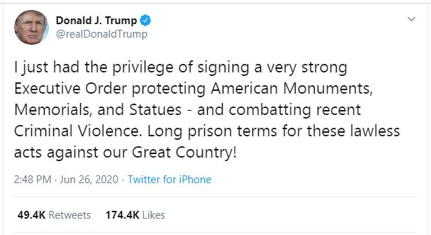 【美新社讯】美国总统川普6月26日发推文表示,“我很荣幸地签署了一项强而有力的行政命令,以保护美国的古迹,纪念馆和雕像,并与最近的刑事暴力作斗争。 这些针对我们伟大国家的非法行为将被判长期监禁!”