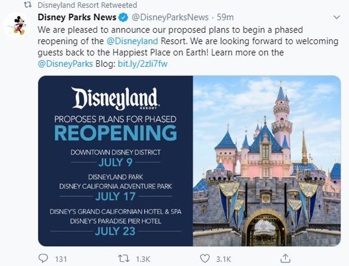 迪士尼集团,也希望7月17日开放迪士尼乐园和迪士尼加州冒险乐园;和7月23日最终开放迪士尼加州大酒店和迪士尼天堂码头酒店。