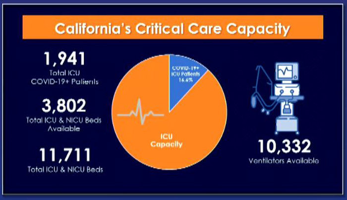 -- 加州共有ICU病床11,711个,可以使用的ICU为3802个。新冠肺炎病例占用的ICU病床为1941个,占总的ICU床位的16.6%。