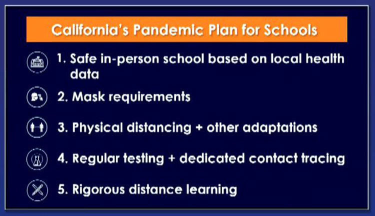 17日当天,州长纽森也宣布加州政府将允许大、中、小学校重新开放课堂教学(In-person Learning),但必须脱离加州政府监控和获得地方卫生部门的许可,否则即将到来的秋季学期和2020-2021新学年,将必须以网络授课的方式开始。