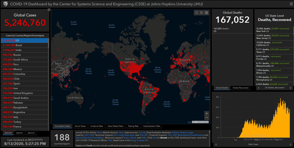 据约翰霍普金斯大学实时新冠状疫情报告,截止美东时间8月13日周四下午5点27分,全美累计新冠确诊病例达到5,246,760个;累计死亡人数达到167,052人。