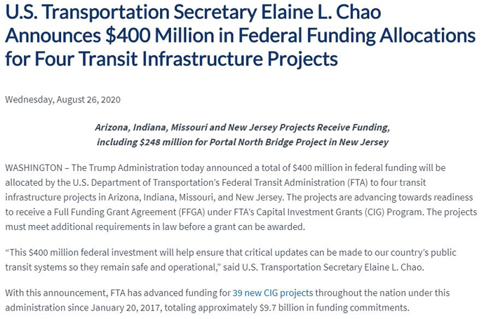 【美新社讯】8月26日,美国交通部部长赵小兰(Elaine L. Chao)宣布,美国运输部的联邦交通管理局(FTA)将向亚利桑那州,印第安纳州,密苏里州和新泽西州的四个公交基础设施项目分配总计4亿美元的联邦资金。
