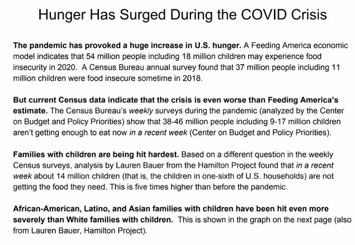 人口普查局在大流行期间进行的每周调查中发现,有3800-4600万人,其中包括900-1700万儿童,在最近一周内面临挨饿的困境。