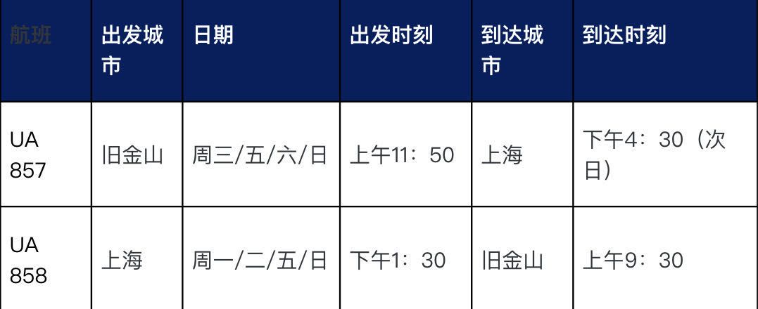10月12日,美國聯合航空(“美聯航”)宣佈,將於2020年10月21日起恢復中美不經停直飛航線,往返於上海浦東至舊金山國際機場,每週運營四班,由波音777-300ER客機執飛,據悉,旅客可於每週三、週五、週六和週日搭乘該航班從舊金山抵達上海,或於每週一、週二、週五和週日從上海出發飛往舊金山。即日起,旅客可登錄美聯航官網或APP預訂機票。