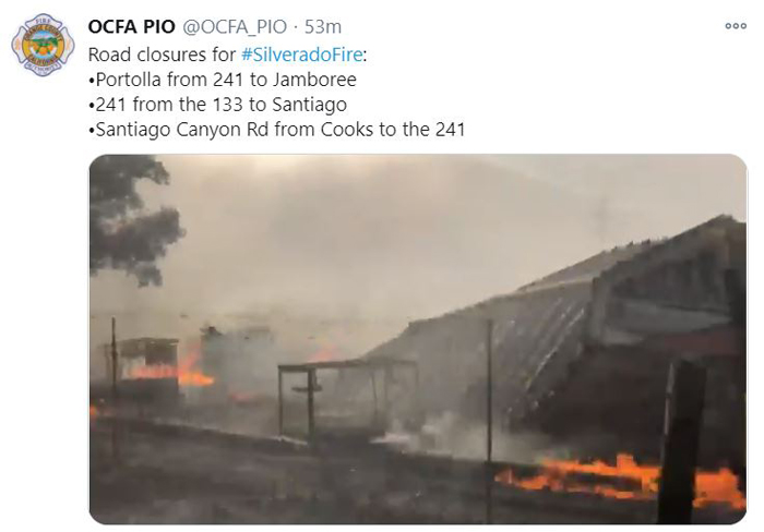 根据加州林业消防局(Calfire),和主导灭火工作的橙县消防局(OCFA)的消息,“西尔弗拉多山火”(Silverado Fire)起火点在圣地亚哥峡谷公路和西尔弗拉多峡谷公路交界处,起火时间大约在上午6点45分。