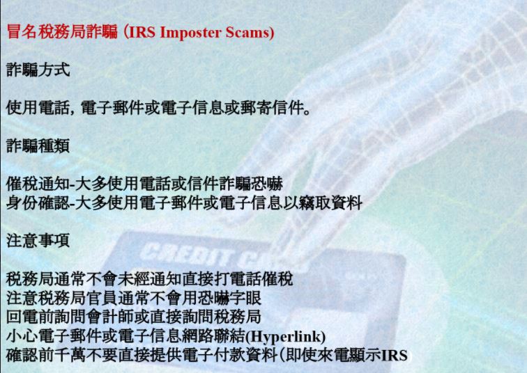 5 位主講人從多層面、多角度探討身份盜竊相關問題,涵蓋身份盜竊的防備、遭遇時如何應變、如何保護個人身份資料及報稅資料、接到國稅局(IRS)寄來查詢郵件應有的應變等豐富內容。