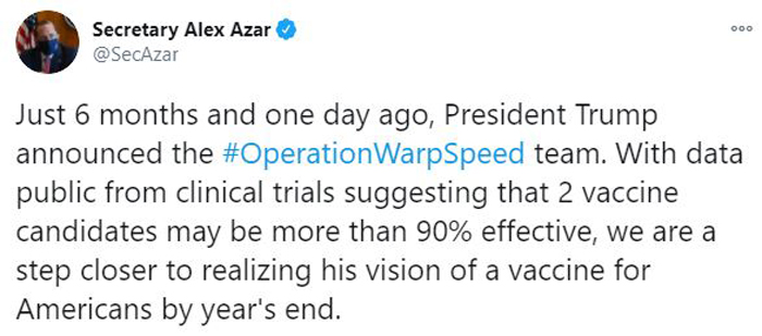 美国卫生部长阿扎尔(Alex Azar)表示,这是白宫设立“神速行动” 疫苗研发小组以来,第二种获得90%有效率的潜在疫苗。距离在2020年年底前推出疫苗的愿景更近了一步。
