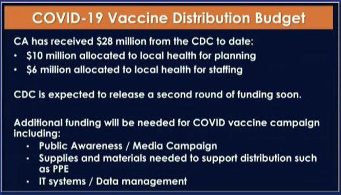 与疫苗储运、接种相关的费用,从联邦CDC获得经费的同时,加州政府也将设法筹措经费,并期望从联邦政府处获得新的资助。
