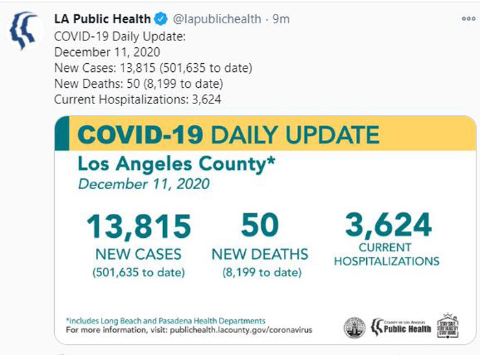 【美新社讯】12月11日(周五),洛杉矶县公共卫生局公告称,洛杉矶县新增确诊病例再次创下新高,达13,815个,并且打破前一天的纪录;同时,新增死亡50人。
