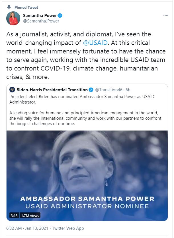 鮑爾在Twitter上表示,“作為一名記者、活動家和外交官,我目睹了美國國際開發署改變世界的影響。在這個關鍵時刻,我感到非常幸運,有機會再次服務,與美國國際開發署令人難以置信的團隊一起應對新冠疫情、氣候變化、人道主義危機等,”。