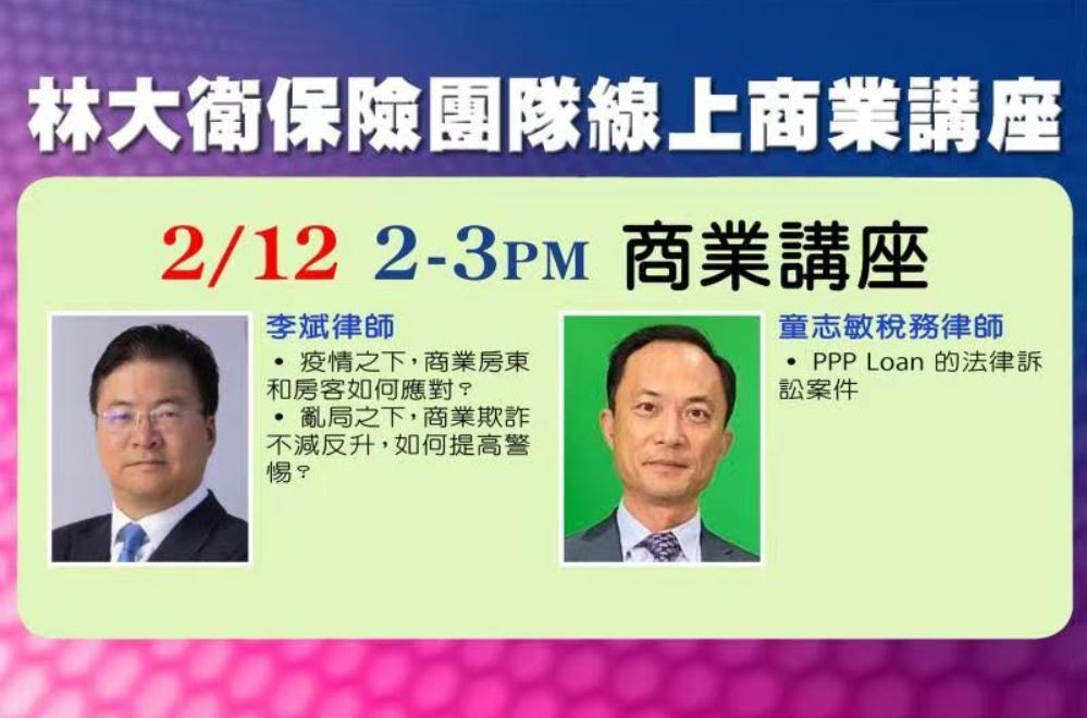 【美新社訊】2021林大衛保險智庫線上商業講座2月5日開始,講座分三次舉行,第一次是2月5日,第二次是2月12日,第三次是2月19日。歡迎民眾報名參加。