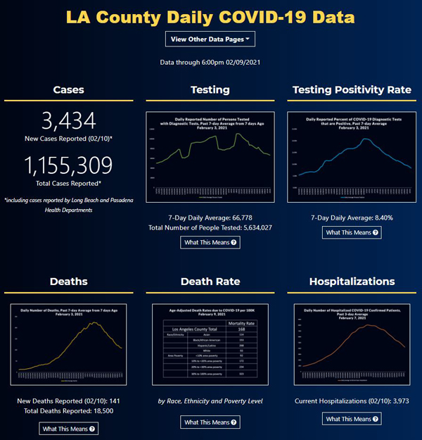 【美新社讯】2021年2月10日(周三),洛杉矶县疫情新增病例数为3434个;同时新增死亡人数为141人;