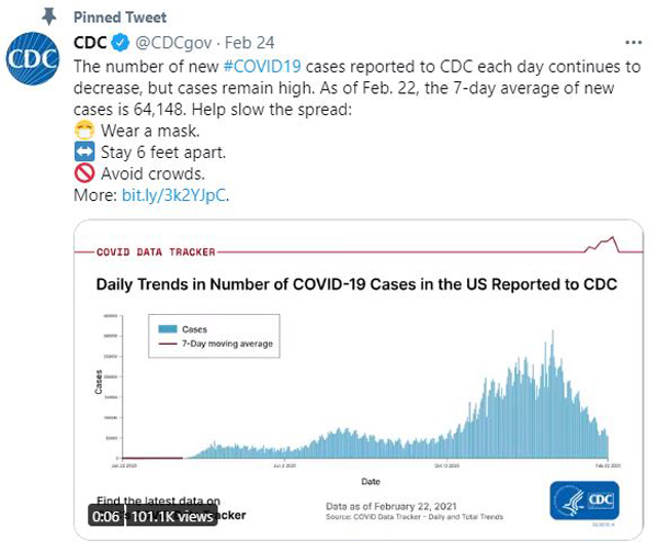 美国疾病控制与预防中心官方推特,依然置顶着防疫三大措施:佩戴口罩/面罩;保持至少6英尺社交距离;避免聚集。