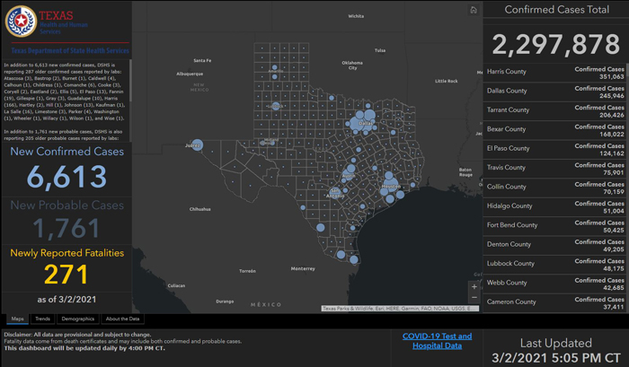 得州3月2日报告新增病例6613个,新增疑似1761个,新增死亡271个;致使其累计病例逼近230万个,达2,297,878个,累计死亡43,266人。