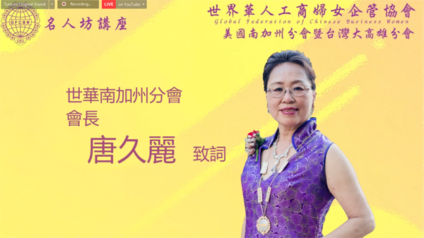 會長唐久麗致詞介紹,今天的兩位主講人,當初僅僅只是有一份工作,之後從一個打工仔提升成成功職業女性,最後她們的職業昇華為一個“企業王國”。她們的思維方式是如何漸進演變的?今天將兩位主講嘉賓結合在一起,跳出框架,讓女性成功舞出一片天。今天上線參加活動的,也有很多年輕一代的女士和男士們,希望藉由今天的中英文雙語同步分享,帶給大家精彩絕倫的故事。