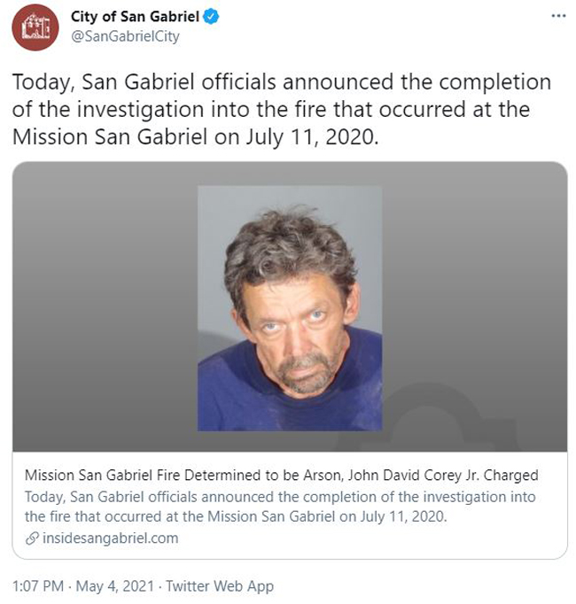 经过多个机构的调查后,确定现年57岁的小约翰·大卫·科里(John David Corey Jr.),是造成圣盖博大教堂(San Gabriel Mission Church)大火的纵火嫌疑人,并遭到正式起诉。