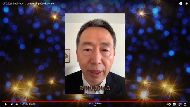 因为多年支持公益和支持对抗新冠病毒,获颁ILF全球企业领袖奖。当年他从哥伦比亚大学毕业后,进入所罗门1997兄弟公司工作,1997年从副总裁一职离任,创办了自己的投资顾问公司。2004年起,Bin Zhao也是中矿收购的财务长,董事。他还是Capital Bridge Investment Ltd.的联合创办人及董事。包括支持哥倫比亞大學研究如何對抗新冠。