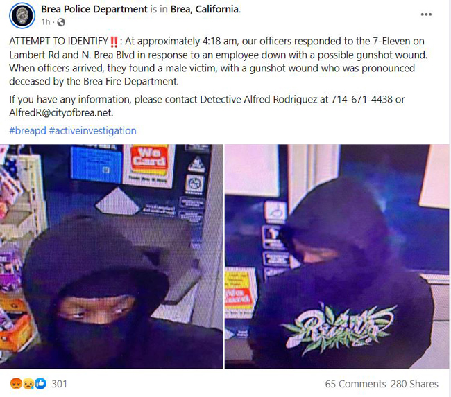 “大约凌晨 4点18分,警官们对位于 Lambert Rd 和 N. Brea Blvd 的 7-Eleven 便利店的报警作出回应,有一名员工可能遭到枪击。当警官们到达时,发现一名男性员工,身上有枪伤。布雷亚市消防局急救人员在现场确认,该员工伤重身亡。