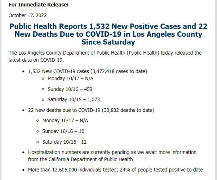 截至2022年10月17日,洛杉矶县累计病例达 3,472,418个,累计死亡达 33,832人。