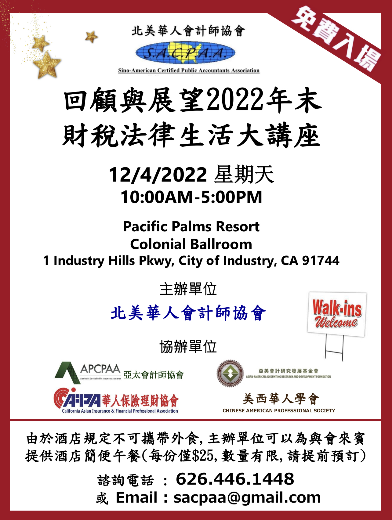 諮詢電話 : 626.446.1448 或Email: sacpaa@gmail.com (因酒店規定不得攜帶外食,如有需要酒店簡易午餐,每份$25,需要提前預約),期待您的參與!