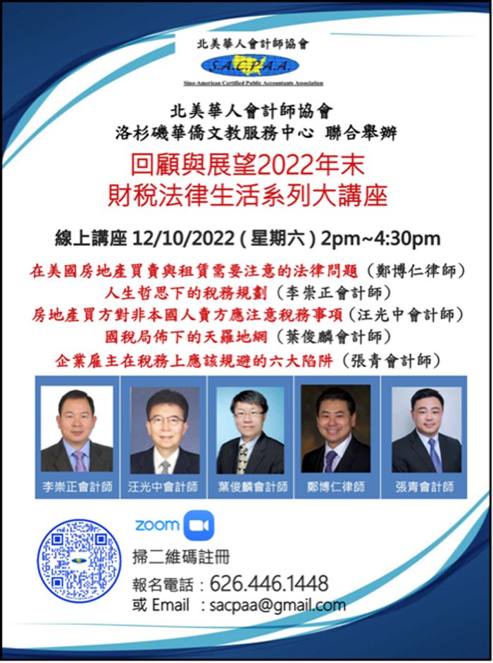 無論您在全美或是全球哪個城市都歡迎上線參加,二場主題都是圍繞著華人最關心的財稅法律生活等最新資訊和年底財稅規劃來準備的。