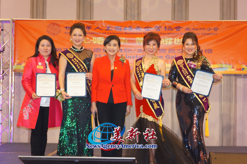 美國國會眾議員 趙美心博士(Dr. Judy Chu),國會眾議員 劉雲平(Ted Lieu)委託母親,加州財務部長 馬世雲(Fiona Ma),加州眾議員 方樹強(Mike Fong),聖蓋博市長 丁言愉(Tony Ding)等先後致詞祝賀交接成功與大會圓滿,並向卸任會長 裴映棋、新任會長 鄭怡薇、新任副會長 游蕙綾和孟心韻 頒發賀狀。