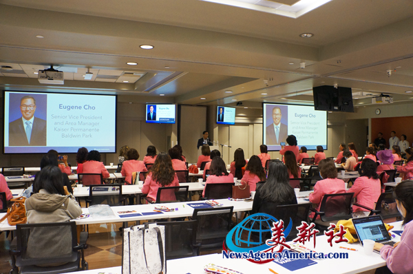 鮑溫公園市的凱撒醫療集團資深副總裁及區域經理 Eugene Cho 特別出席和致詞,歡迎世華姊妹蒞臨的同時,也介紹了凱撒醫療集團從沙漠戈壁小診所,到遍布全美多地的大型醫療集團的發展歷程。