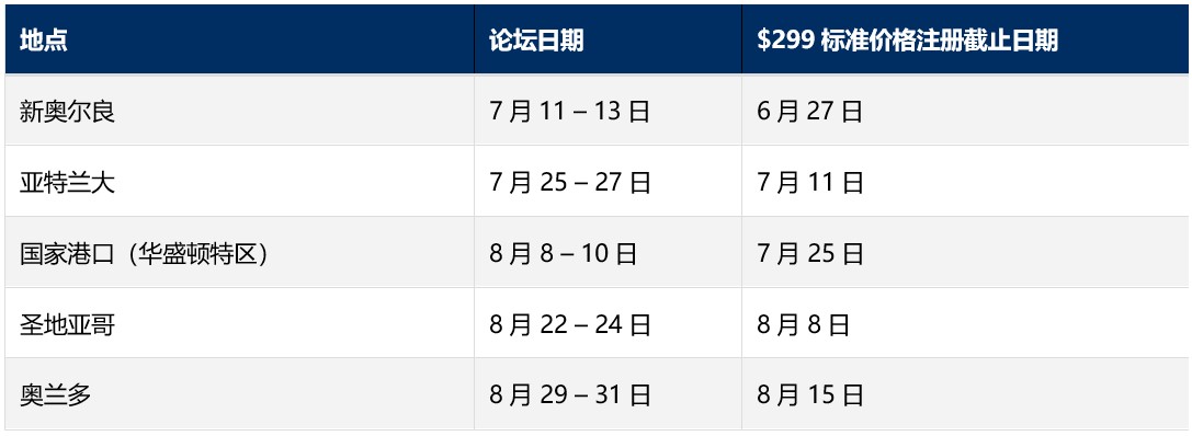在 6 月 15 日早鸟价截止日前注册的与会者,可以享受每人 245 美元的最低价格。这比标准价节省54 美元,比现场注册价节省 135 美元。标准定价从 6 月 15 日开始,到每个论坛开始前两周结束。参与协会的成员如果在 6 月 15 日之前注册,可在早鸟价基础上获得额外10 美元的折扣。