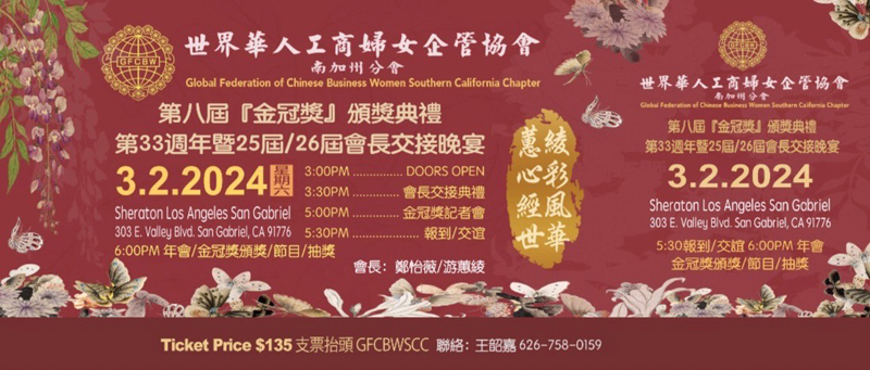 【美新社洛杉磯訊】世界華人工商婦女企管協會南加州分會(以下簡稱世華南加分會)第8屆『金冠獎』頒獎典禮、第33周年慶暨第25屆/26屆會長交接晚宴將於2024年3月2日在聖蓋博喜來登大酒店閃亮揭幕。
