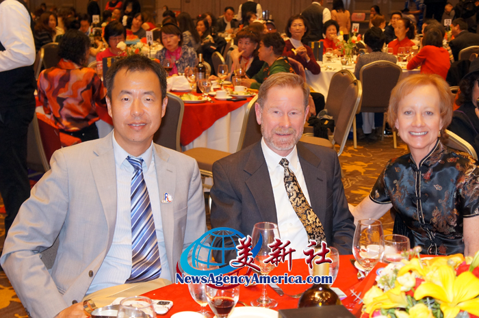 前美国教育部助理副部长、美国劳工部美西总长、美国南加州大学教授张曼君(Marina Tse,中)与奥斯卡奖得主理查德·L·安德森(Richard L. Anderson,右)致词祝贺