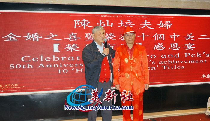 各民選官員紛紛上台向陳燦培伉儷送上祝福及頒發表揚狀。陳燦培分享了他與妻子李碧清的姻緣。他表示,1972年,他們二人同時參加中加州 San Luis Obispo 的夏令管,晚上用餐時,剛好同坐一桌,他覺得湯水毫無味道,李碧清立刻遞上餐桌鹽給他;因此,他們互相認識的重要時刻誕生了!