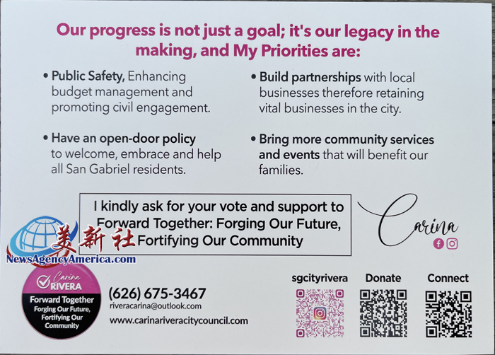 【美新社圣盖博讯】曾出任过圣盖博市议员的 Carina Rivera(卡丽娜·里维拉)积极竞选,谋求圣盖博市议会席位。9月4日周三晚间,于该市举行竞选启动派对,宣传竞选理念,强调竞选口号:共同前进:打造我们的未来,巩固我们的社区(Forward Together: Forging Our Future, Fortifying Our Community)!