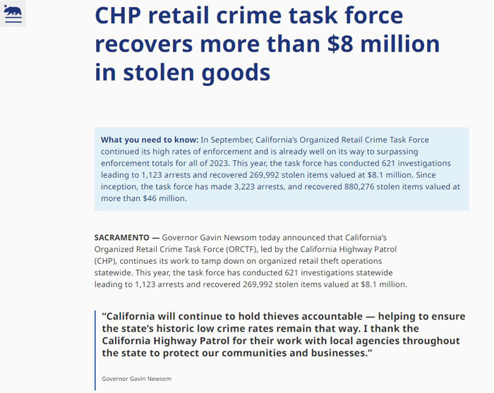關鍵詞: 加州,州长纽森,Gavin Newsom,加州高速公路巡警,CHP,加州有组织零售犯罪特别工作组,ORCTF,追回被盗物品