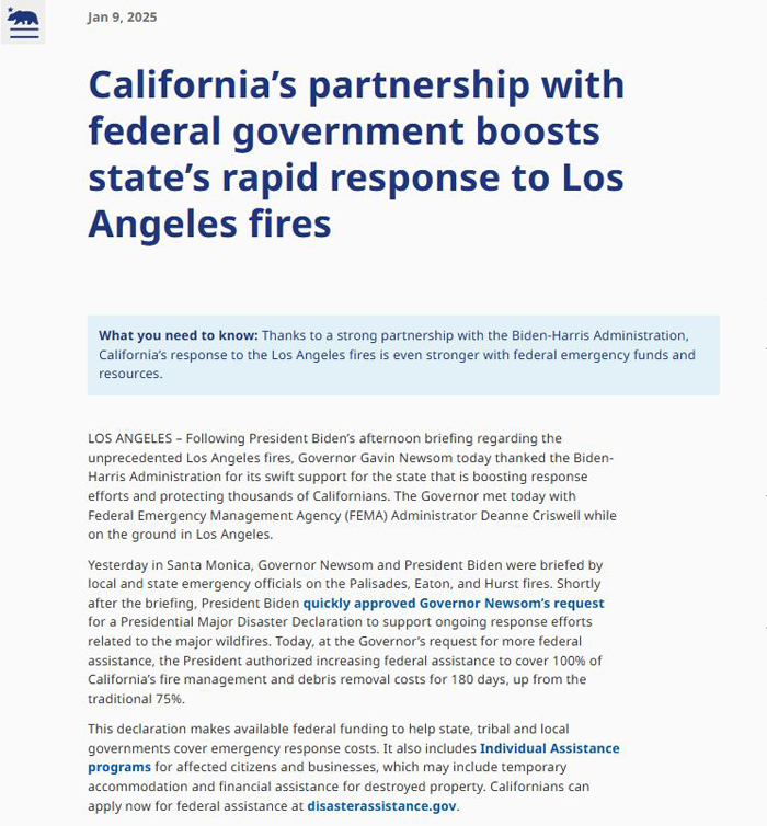 本周早些时候,纽森州长宣布,加州已从联邦紧急事务管理局 (FEMA) 获得火灾管理援助补助金 (FMAG),以帮助确保提供重要资源来协助扑灭洛杉矶县的帕利塞兹、伊顿和赫斯特大火。 FMAG 由总统救灾基金以分摊成本的方式提供,将协助应对火灾的地方、州和部落机构申请 100% 的合格消防费用报销。