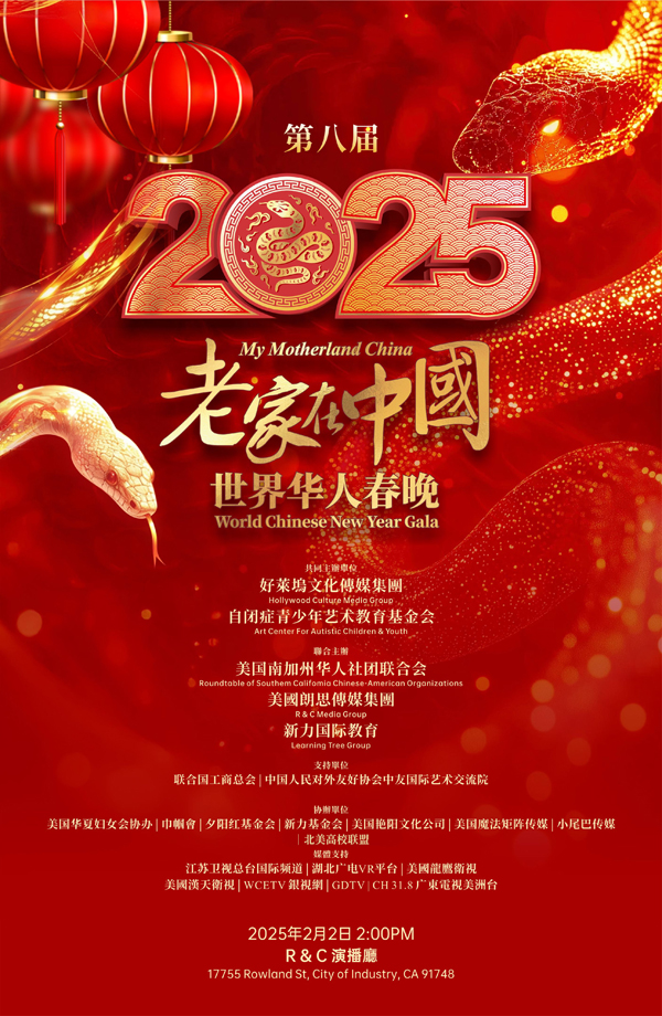 2025年2月2日下午2时,第八届“老家在中国”世界华人春晚在美国洛杉矶隆重举行。本届晚会由好莱坞文化传媒集团、自闭症青少年艺术教育基金会主办;并由美国南加州华人社团联合会、美国朗思传媒集团、加州企业家联盟、新力国际教育联合主办;美国华夏妇女会、美国魔法矩阵传媒、小尾巴传媒、夕阳红基金会、新力基金会、巾帼會、3H BIOSTECH LLC、美国艳阳文化公司、北美高校联盟协办;并得到联合国工商总会、中国人民对外友好协会、中友国际艺术交流院等机构的鼎力支持。