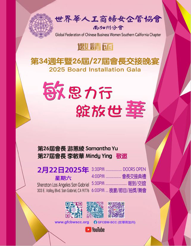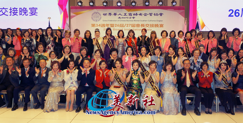 【美新社洛杉磯訊】2025年2月22日週六晚間,世界華人工商婦女企管協會南加州分會(以下簡稱世華南加州分會)於聖蓋博喜來登大酒店盛大舉行第34週年慶暨26屆/27屆會長交接晚宴。