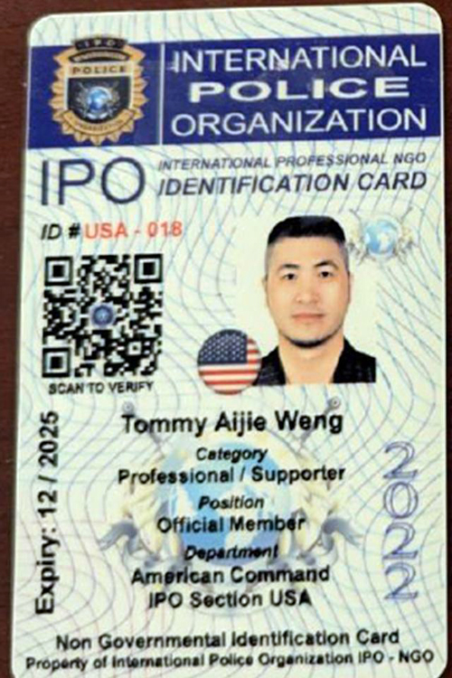 🛑 嫌疑人翁向女性受害者展示了一枚所谓的执法证件(实则没有任何法律权威),并给了她一张印有他名字的「国际警官协会(International Police Organization)」名片。 还有一次,嫌疑人翁告诉女性受害者,他曾在美国国土安全部工作,现在将调往意大利国际刑警组织担任新的执法职务。另外,嫌疑人翁告驾驶着一辆红色悍马车,车牌上含有「ICE」的缩写,「ICE」在真实世界中是联邦执法机构移民和海关执法局的缩写。