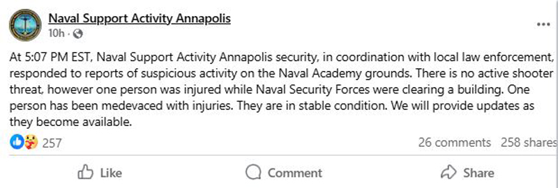 🛑 美国东部时间下午5:07,安纳波利斯海军支援活动中心的安保人员与当地执法部门协调,对海军学院场地内可疑活动的报告作出了回应。“出于高度谨慎”,学院进入紧急封锁状态。