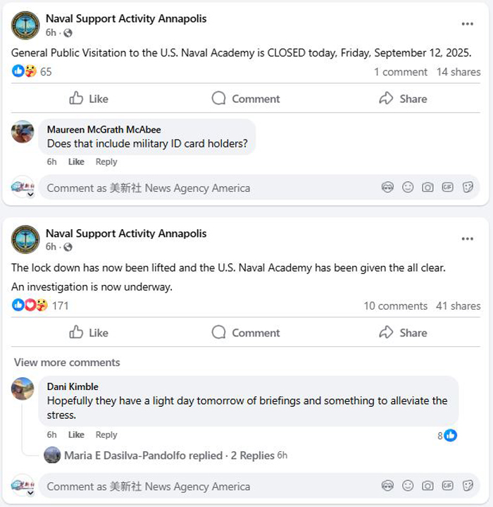 紧急封锁解除,9月12日暂停公众访问的相关公告(美国海军学院社交媒体图片)