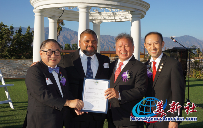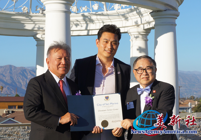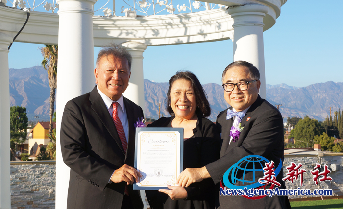 前加州眾議員、現任聖蓋博谷水利局董事會董事伍國慶(Mike Eng,中)頒發賀狀