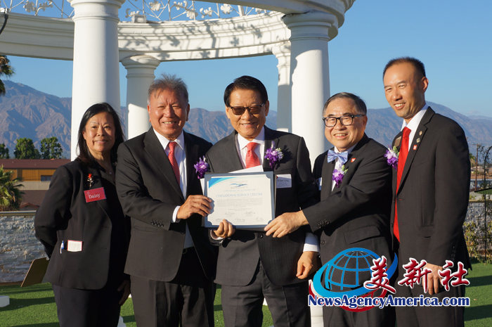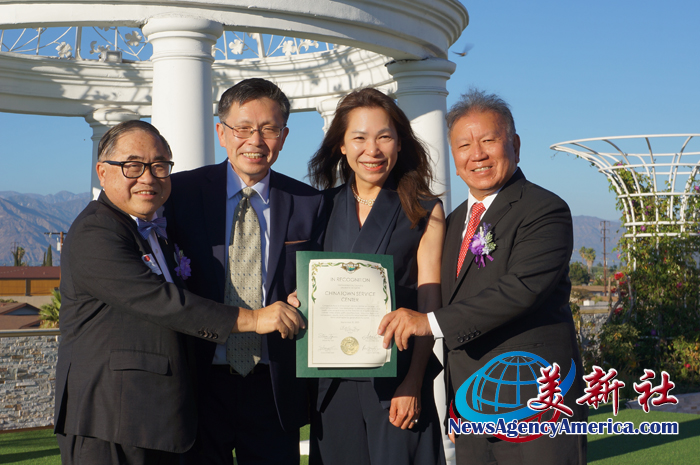 鑽石吧(Diamond Bar)市長鄧嘉猷(Chia Yu Teng,左2)和核桃谷水利局董事會董事李敏妮(Theresa Lee,右2)頒發賀狀