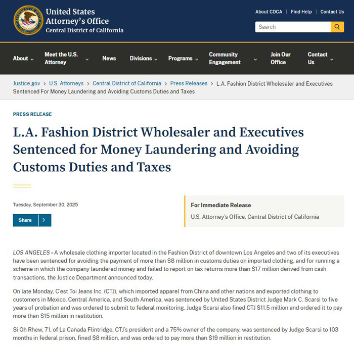 【美新社讯】9月30日周二,美国司法部(DOJ)发布公告披露:位于洛杉矶市中心时尚区(LA Fashion District)的一家服装批发进口商及其两名高管因逃避缴纳超过 800 万美元的进口服装关税,以及实施洗钱计划并未能申报超过 1700 万美元现金交易所得的纳税申报单而被判刑。