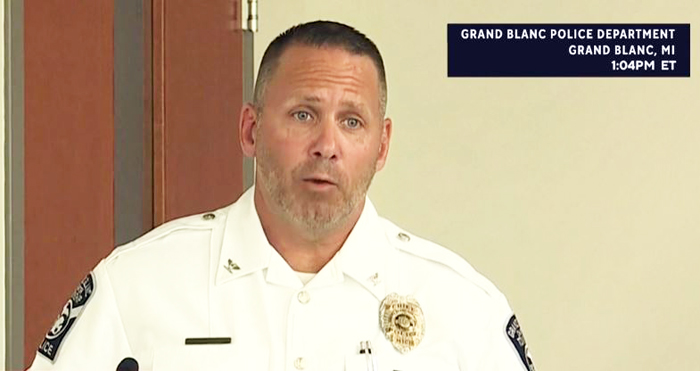 Grand Blanc 警察局局长 William Renye 在新闻发布会(Grand Blanc 警察局社交媒体图片)
